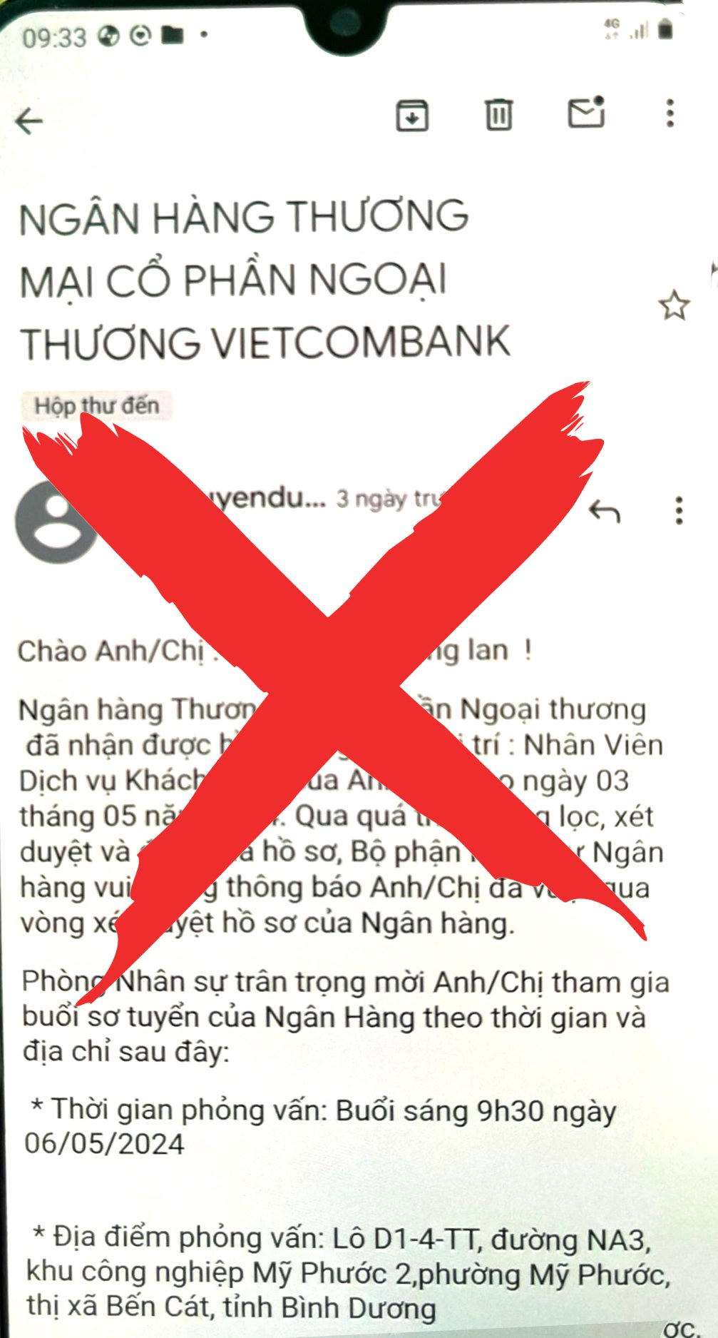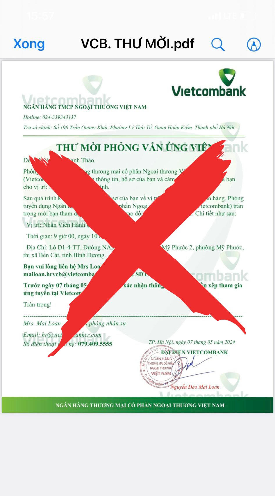 Vietcombank cho biết ngân hàng chỉ thông báo, liên hệ với ứng viên ứng tuyển vào Vietcombank thông qua email với tên miền duy nhất: vietcombank.com.vn. Tất cả các tên miền khác đều là giả mạo. Ngoài ra, tất cả các bước trong quá trình tuyển dụng đều thực hiện tại các văn phòng trụ sở của VCB.