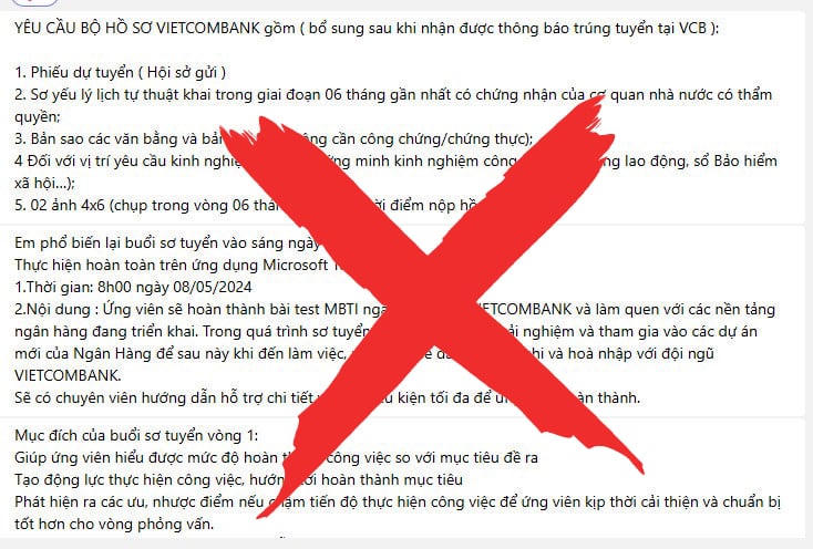 Ngân hàng lưu ý các khách hàng phải cực thận trọng, đồng thời khẳng định Vietcombank không thu bất kỳ khoản phí nào trong suốt quá trình tuyển dụng ứng viên; không yêu cầu cung cấp thông tin tài khoản, giao dịch hay mã số OTP; không liên hệ với ứng viên hay tổ chức vòng sơ loại online thông qua đường dẫn link/app trò chuyện.