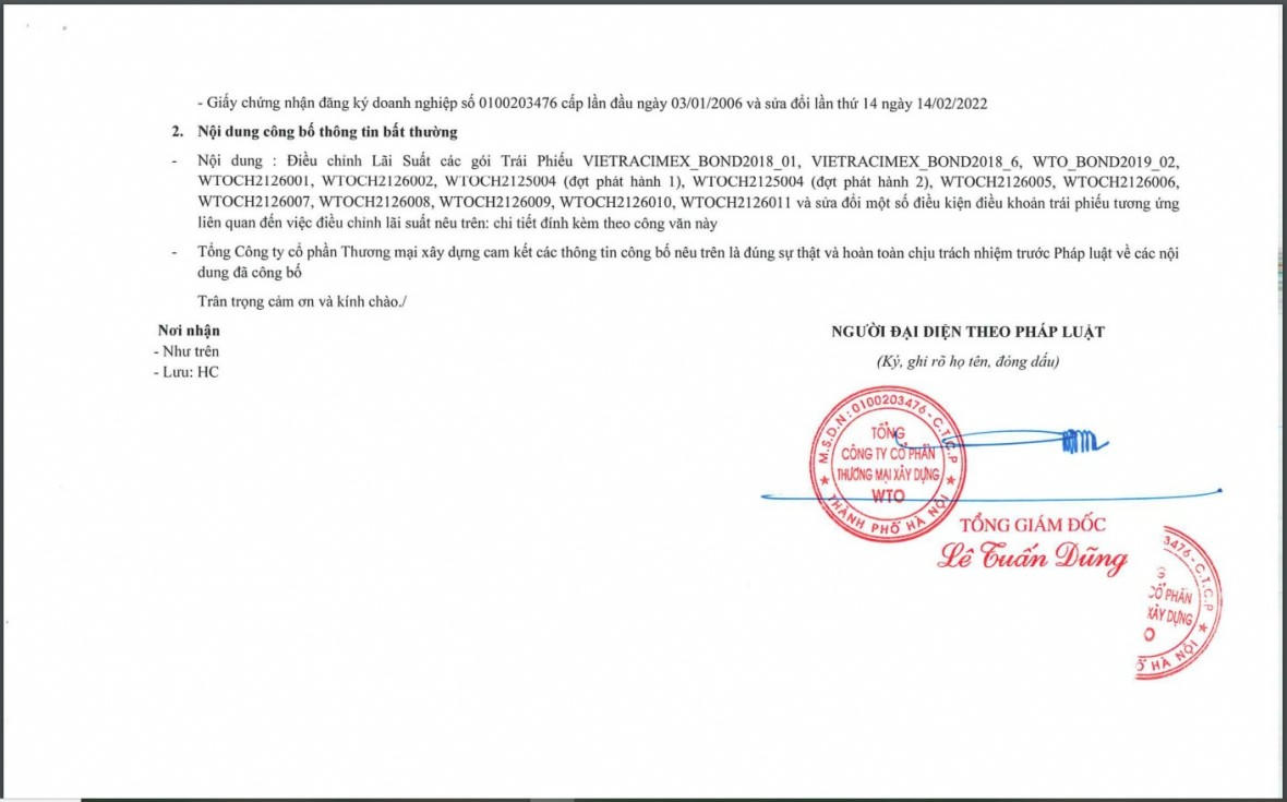 Cũng liên quan đến các lô trái phiếu của Vietracimex, mới đây, doanh nghiệp này đã công bố thông tin điều chỉnh lãi suất các lô trái phiếu có mã lần lượt là VIETRACIMEX_BOND2018_01, VIETRACIMEX BOND2018_6, WTO_BOND2019_02, WTOCH2126001, WTOCH2126002, WTOCH2125004 (đợt phát hành 1), WTOCH2125004 (đợt 2), WTOCH2126005, WTOCH2126006, WTOCH2126007, WTOCH2126008, WTOCH2126009, WTOCH2126010, WTOCH2126011 và sửa đổi một số điều kiện điều khoản trái phiếu tương ứng liên quan đến việc điều chỉnh lãi suất nêu trên.