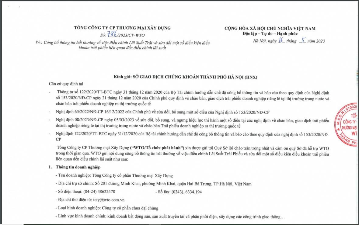 Tính đến cuối năm 2022, Tổng CTCP Thương mại Xây dựng - Vietracimex (nay là WTO) ghi nhận khoản nợ hơn 35.600 tỷ đồng. Trước đó, doanh nghiệp này còn bị phạt hơn 6 tỷ đồng do chậm thanh toán lãi của 4 lô trái phiếu.