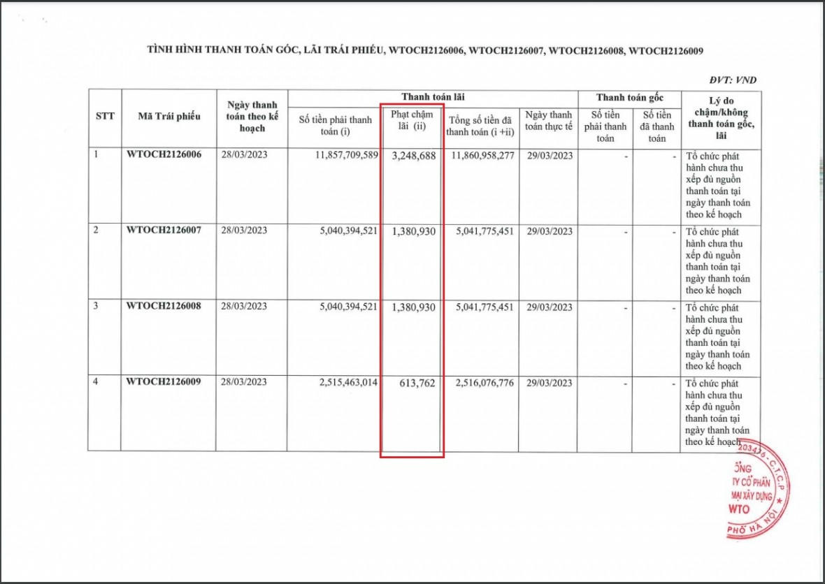 Cụ thể, Vietracimex đã trả lãi trái phiếu mã WTOCH2126006, WTOCH2126007, WTOCH2126008 và WTOCH2126009 vào ngày 29/3/2023, chậm một ngày so với ngày thanh toán kế hoạch là 28/3/2023.