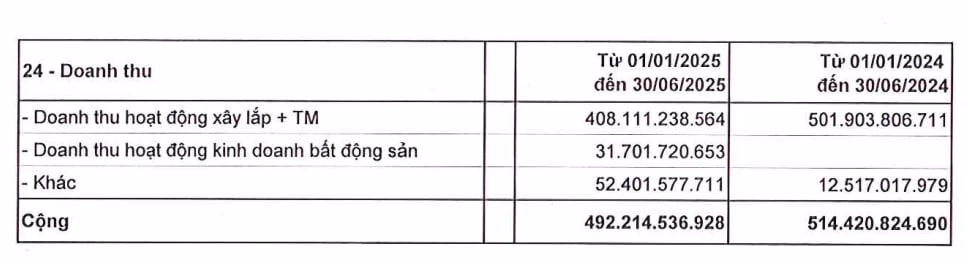 Đáng chú ý, luỹ kế 6 tháng của năm 2025 công ty phát sinh doanh thu từ hoạt động kinh doanh bất động sản (hơn 31,7 tỷ đồng), cùng kỳ năm ngoái không có phát sinh.