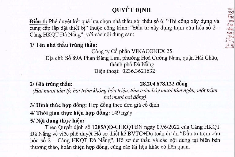 Ngày 23/8/2022, Giám đốc Cảng hàng không quốc tế Đà Nẵng ký Quyết định 2085/QĐ-CHKQTĐN phê duyệt kết quả lựa chọn nhà thầu gói thầu số 6: Thi công xây dựng và cung cấp lắp đặt thiết bị, dự án Trạm cứu hỏa số 2.