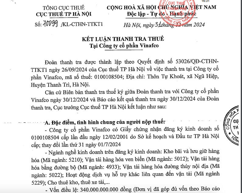 Theo kết luận của cơ quan thuế, VINAFCO có tổng số tiền thuế truy thu, tiền phạt và tiền chậm nộp là hơn 4,28 tỷ đồng. Số tiền chậm nộp tiền thuế của công ty được tính đến hết ngày 31/12/2024.