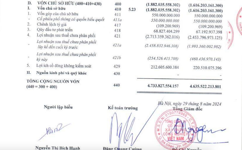 Ngoài hoạt động kinh doanh không hiệu quả, sức khỏe tài chính của VINAINCON cũng không mấy khả quan. Do thua lỗ nhiều năm liên tiếp, vốn chủ sở hữu của VINAINCON tính đến cuối quý II/2024 âm tới 1.882 tỷ đồng.