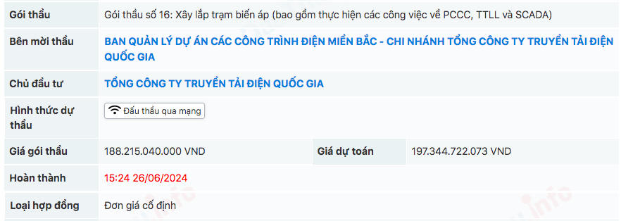 Đơn cử, ngày 26/6/2024 Liên danh VINAINCON – Công ty TNHH MTV Xây lắp điện 2 trúng Gói thầu số 16 Xây lắp trạm biến áp (bao gồm thực hiện các công việc về PCCC, TTLL và SCADA) do Tổng công ty truyền tải điện Quốc gia làm chủ đầu tư. Giá trúng thầu hơn 183,28 tỷ đồng, giá dự toán gói thầu hơn 197,34 tỷ đồng.