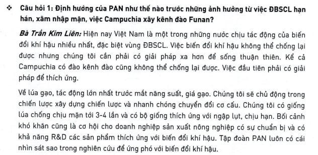 "Tuy nhiên, biến đổi khí hậu là điều mà chúng ta không thể chống lại được. Nếu như Campuchia đào kênh Funan và khiến chúng ta thiếu nước ngọt cho sản xuất thì cũng không thể làm gì được, do đó, doanh nghiệp phải có giải pháp thích ứng với biến đổi khí hậu và thuận thiên" - bà Liên nói.