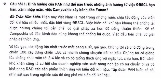 Cụ thể, trong Đại hội Cổ đông thường niên năm 2024 của CTCP Tập đoàn PAN, Chủ tịch HĐQT Vinaseed - bà Trần Kim Liên, cho biết hiện tại cũng như sau này, Việt Nam là 1 trong những nước chịu ảnh hưởng nhiều nhất của biến đổi khí hậu, đặc biệt là khu vực Đồng bằng sông Cửu Long. Doanh nghiệp không thể chỉ nhìn vào khó khăn mà phải chủ đông xây dựng chiếc lược chuyển đổi mô hình kinh doanh, chuyển đổi cơ cấu cây trồng thích ứng biến đổi khí hậu.