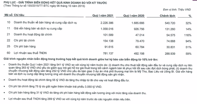 Trong quý I năm 2021, theo đà phục hồi chung của thị trường bấtđộng sản bán lẻ, Vincom Retail tiếp tục ghi nhận sự tăng trưởng tích cực trong hoạt động kinh doanh. Doanh thu hợp nhất đạt 2.226 tỷ đồng, tăng 32% so với cùng kỳ năm 2020. Trong đó, hoạt động cho thuê bất động sản đầu tư đạt 1.712 tỷ đồng, tăng 18,2%. Doanh thu từ mảng chuyển nhượng bất động sản đạt 452 tỷ đồng, tăng 124,9%, chủ yếu đến từ việc bàn giao ba dự án nhà phố thương mại lớn là Mỹ Tho, Bạc Liêu và Uông Bí. Bên cạnh đó, việc giảm quy mô gói hỗ trợ giá thuê khách hàng bán lẻ cũng giúp doanh thu của Vincom Retail tăng thêm 263 tỷ đồng. Lợi nhuận sau thuế hợp nhất đạt 781 tỷ đồng, tăng 58,7% so với cùng kỳ.