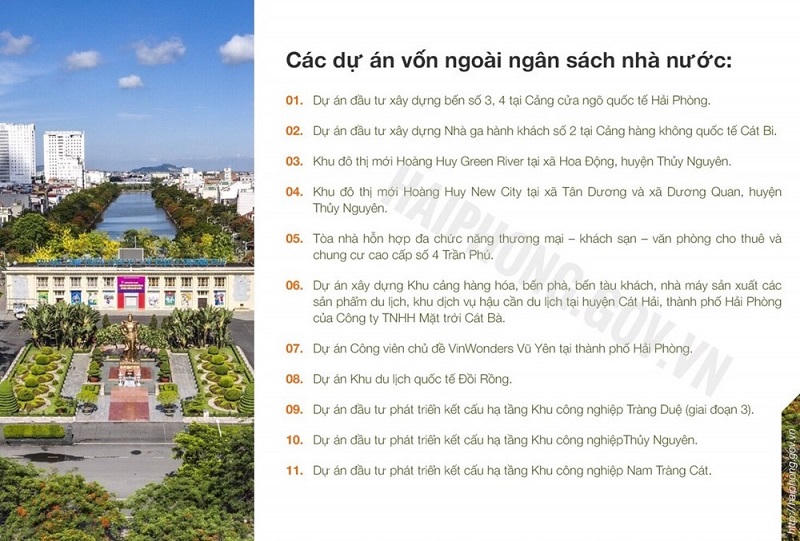 Bên cạnh đó, 11 dự án vốn ngoài ngân sách nhà nước gồm: Dự án đầu tư xây dựng bến số 3, 4 tại Cảng cửa ngõ quốc tế Hải Phòng do CTCP Cảng Hải Phòng làm chủ đầu tư; dự án đầu tư xây dựng Nhà ga hành khách số 2 tại Cảng hàng không quốc tế Cát Bi do Công ty Cảng Hàng không Việt Nam – CTCP (ACV) làm chủ đầu tư. Dự án Khu đô thị mới Hoàng Huy Green River (xã Hoa Động, huyện Thủy Nguyên) và dự án Khu đô thị mới Hoàng Huy New City (xã Tân Dương và Dương Quan, huyện Thủy Nguyên) do CTCP Đầu tư Dịch vụ Tài chính Hoàng Huy làm chủ đầu tư; dự án Tòa nhà hỗn hợp đa chức năng thương mại – khách sạn – văn phòng cho thuê và chung cư cao cấp số 4 (đường Trần Phú, quận Ngô Quyền).