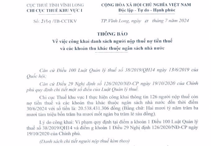 Ngày 12/7/2024, theo thông tin từ Cục Thuế tỉnh Vĩnh Long, ngày 11/7/2024, Chi cục Thuế khu vực I trực thuộc Cục Thuế tỉnh Vĩnh Long đã có Thông báo số 2134/TB-CCTKV về việc thực hiện công khai danh sách 126 người nộp thuế còn nợ tiền thuế và các khoản thu khác thuộc ngân sách nhà nước đến thời điểm 30/6/2024 với số tiền là hơn 20 tỷ đồng.
