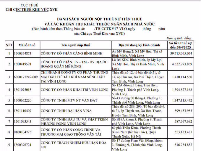 Dẫn đầu danh sách là Công ty Cổ phần Cảng Bình Minh (MST: 1500354873, địa chỉ tại Ấp Mỹ Hưng 2, xã Mỹ Hòa, Thị xã Bình Minh, tỉnh Vĩnh Long) nợ thuế gần 40 tỷ đồng.