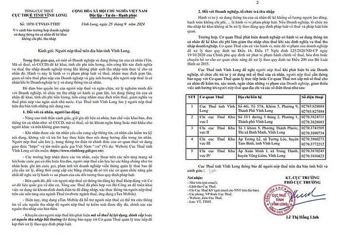 Cục Thuế tỉnh Vĩnh Long ban hành văn bản số 1070/CTVLO-TTHT cảnh báo trường hợp doanh nghiệp sử dụng thông tin cá nhân để kê khai khống chi phí, thu nhập.