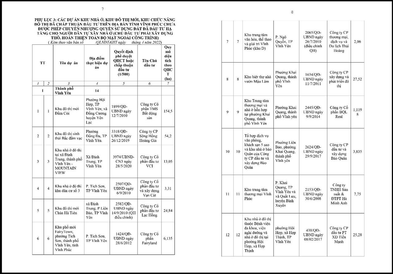Cụ thể, thành phố Vĩnh Yên có 14 dự án gồm: Khu đô thị mới Đầm Cói (chủ đầu tư là Công ty Cổ phần TMS Bất động sản); Khu đô thị sinh thái Bắc Đầm Vạc (chủ đầu tư là Công ty cổ phần Sông Hồng Hoàng Gia); Khu nhà ở đô thị tại xã Định Trung, thành phố Vĩnh Yên – Mountain View (chủ đầu tư là Công ty cổ phần đầu tư VCI); Khu nhà ở đô thị khu dân cư số 3 (chủ đầu tư là Công ty cổ phần đầu tư và xây dựng Vạn Cát); Khu đô thị mới Chùa Hà Tiên (chủ đầu tư là Công ty cổ phần đầu tư Lạc Hồng); Khu phố mới FairyTown phường Tích Sơn (chủ đầu tư là Công ty cổ phần Fairyland);