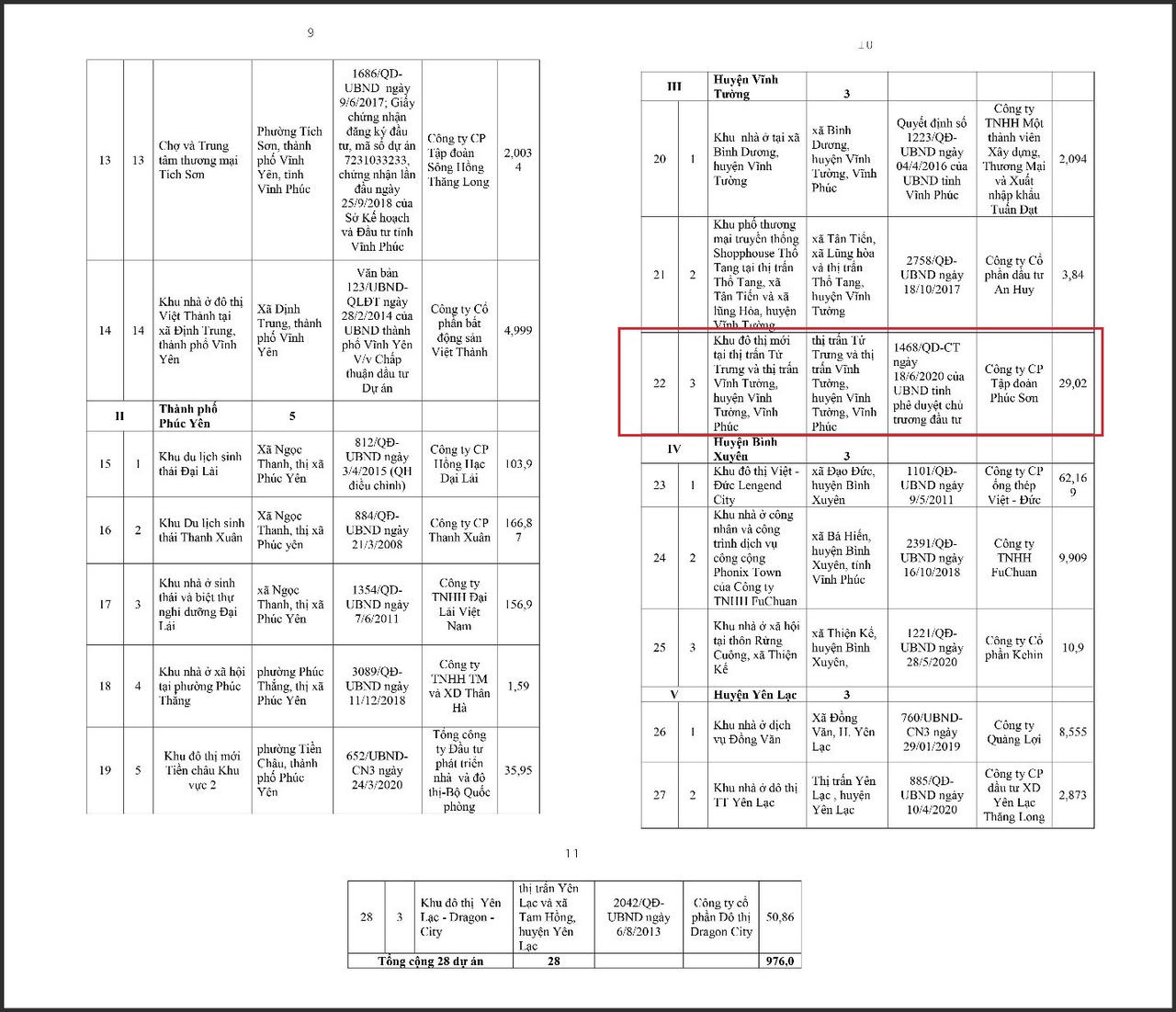 Trong danh sách 28 dự án chưa được phép chuyển nhượng được Sở Xây dựng tỉnh Vĩnh Phúc công bố có dự án đáng chú là dự án Khu đô thị mới tại thị trấn Tứ Trưng do Tập đoàn Phúc Sơn làm chủ đầu tư.