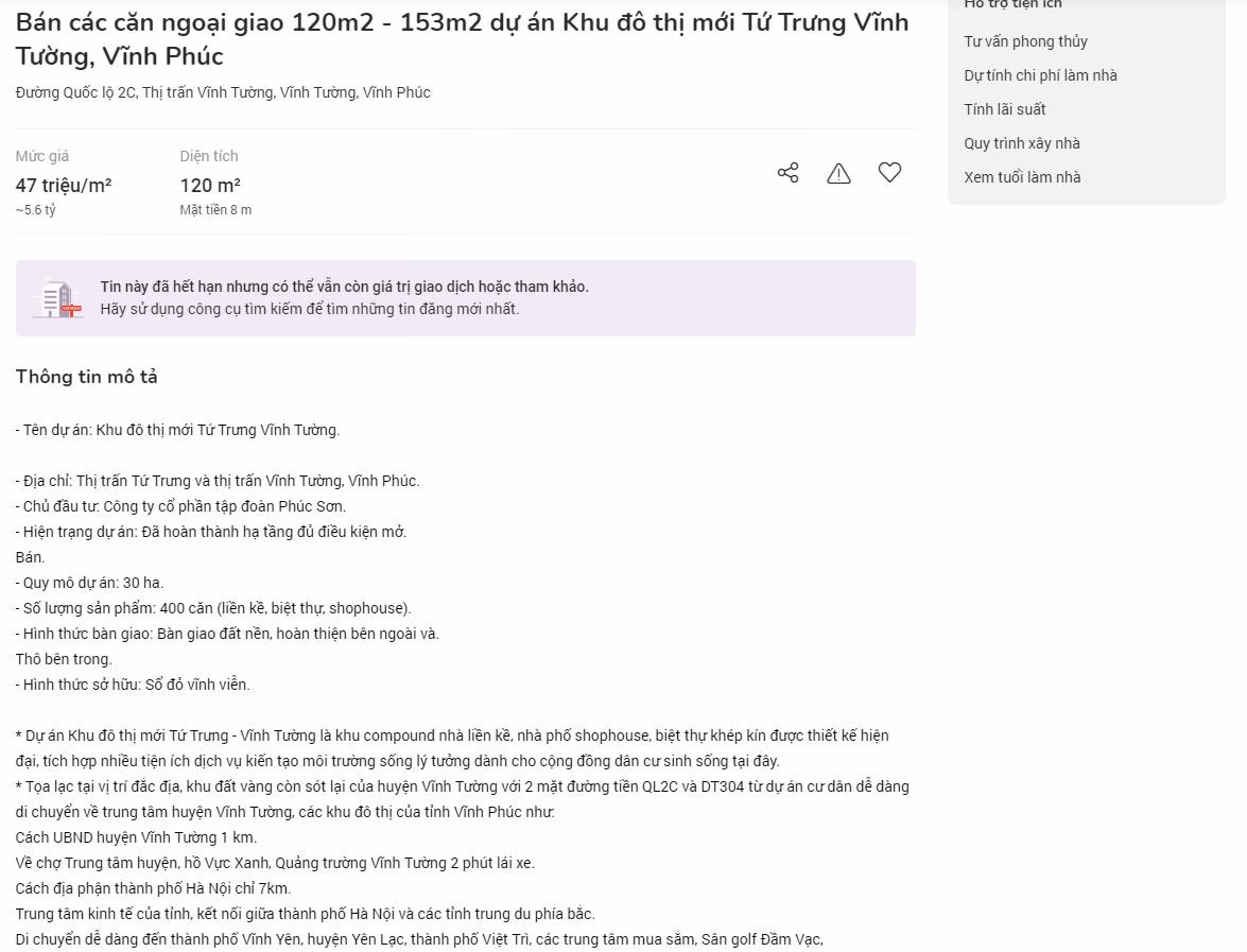 Mặc dù nằm trong danh sách 28 dự án chưa đủ điều kiện mở bán, nhưng trước đó trên một số website, sàn môi giới, mạng xã hội,… dự án này đã được rao bán rầm rộ với những ngôn từ mỹ miều như: “Dự án Khu đô thị mới Tứ Trưng - Vĩnh Tường là khu compound nhà liền kề, nhà phố shophouse, biệt thự khép kín được thiết kế hiện đại, tích hợp nhiều tiện ích dịch vụ kiến tạo môi trường sống lý tưởng dành cho cộng đồng dân cư sinh sống tại đây”. Hay “dự án tọa lạc tại vị trí đắc địa, khu đất vàng còn sót lại của huyện Vĩnh Tường. Dự án được thiết kế theo phong cách tân cổ điển châu Âu”,…