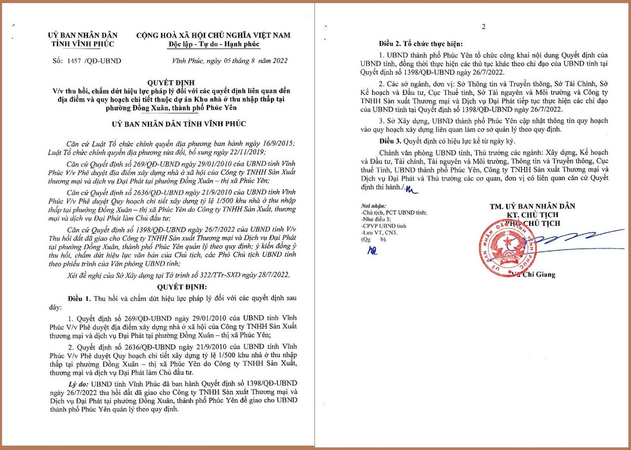 Trước đó, vào hôm 14/6, Sở Tài Nguyên và Môi trường tỉnh Vĩnh Phúc đã phát đi thông báo số 1874/STNMT-QLĐĐ về việc thu hồi đất đã giao thực hiện dự án khu nhà ở thu nhập thấp tại phường Đồng Xuân do Công ty TNHH Sản xuất TM&DV Đại Phát làm chủ đầu tư.