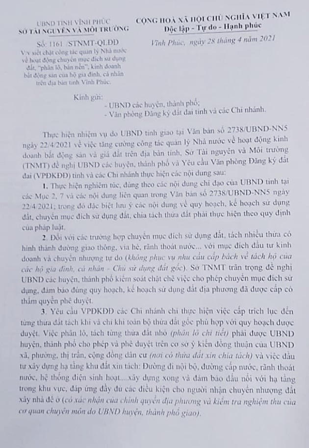 Vừa qua, UBND tỉnh Vĩnh Phúc có văn bản số 2738/ UBND-NN5, về việc tăng cường công tác quản lý Nhà nước về hoạt động kinh doanh bất động sản và giá đất trên địa bàn tỉnh, Sở TN&MT tỉnh Vĩnh Phúc có văn bản số 1161/STNMT-QLĐĐ ngày 28/4, siết chặt công tác quản lý Nhà nước về hoạt động chuyển nhượng mục đích sử dụng đất “phân lô, bán nền”, kinh doanh bất động sản của hộ gia đình, cá nhân trên địa bàn tỉnh Vĩnh Phúc.