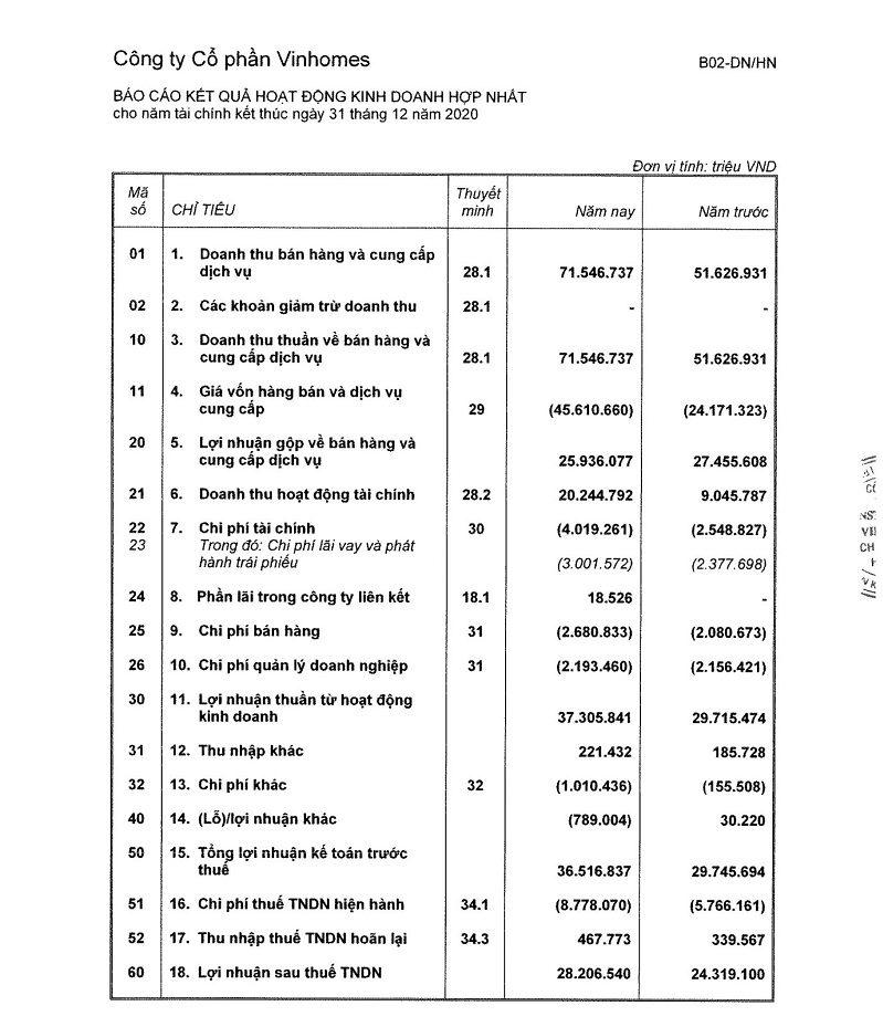 Kết thúc năm 2020, tổng doanh thu thuần hợp nhất Vinhomes đạt 71.547 tỷ đồng. Trong đó, doanh thu từ hoạt động chuyển nhượng bất động sản đạt 67.310 tỷ đồng và doanh thu từ cho thuê bất động sản đạt 898 tỷ đồng. Lợi nhuận trước thuế năm 2020 của Công ty đạt 36.517 tỷ đồng, tăng 23% so với năm 2019 và lợi nhuận sau thuế năm 2020 đạt 28.207 tỷ đồng, tăng 16% so với năm 2019.