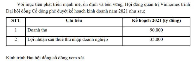 Với mục tiêu phát triển mạnh mẽ, ổn định và bền vững, Hội đồng quản trị Vinhomes đã trình Đại hội đồng Cổ đông phê duyệt kế hoạch kinh doanh năm 2021. Theo đó công ty đặt chỉ tiêu doanh thu hợp nhất và lợi nhuận sau thuế cả năm ở mức 90.000 tỉ đồng và 35.000 tỉ đồng.