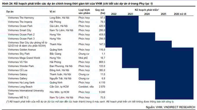 Vào cuối năm nay, Tập đoàn Vinhomes sẽ ra mắt dự án Mega Grand World, đồng thời mở các dự án nhà ở xã hội. Sang giai đoạn 2024 - 2025, công ty sẽ mở bán các đại dự án như Cổ Loa (Hà Nội), Vũ Yên (Hải Phòng), Long Beach (TP.HCM),...
