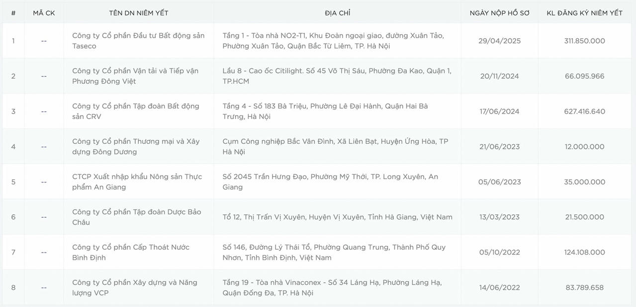 Ngoài TAL, hệ thống của HoSE vẫn đang ghi nhận 7 doanh nghiệp khác đang trong quá trình nộp hồ sơ niêm yết như Công ty Cổ phần Vận tải và Tiếp vận Phương Đông Việt, Công ty Cổ phần Tập đoàn Bất động sản CRV, Công ty Cổ phần Thương mại và Xây dựng Đông Dương, Công ty Cổ phần Xuất nhập khẩu Nông sản Thực phẩm An Giang, Công ty Cổ phần Tập đoàn Dược Bảo Châu,... Tuy nhiên, khác với Vinpearl khi chỉ trong 2 tháng đã được duyệt hồ sơ, nhiều doanh nghiệp đã nộp hồ sơ từ năm 2022, 2023 và 2024 vẫn đang trong danh sách này.