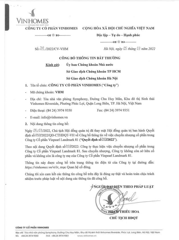 Theo đó, Vinhomes đã thông qua việc chuyển nhượng cổ phần tại Công ty cổ phần Vinpearl Landmark 81. Sau giao dịch, Vinhomes sẽ không còn sở hữu cổ phần và không còn là công ty mẹ của Vinpearl Landmark 81. Về bên nhận chuyển nhượng thì không được công bố.