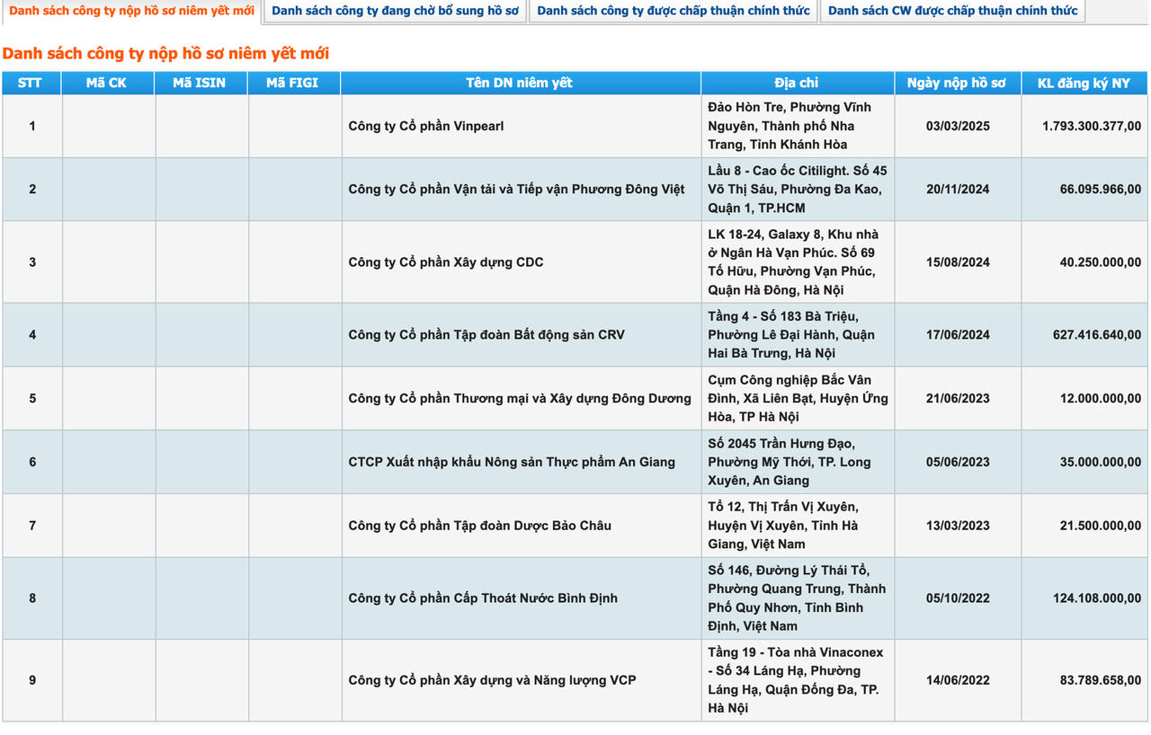 Bên cạnh Vinpearl, một số doanh nghiệp khác cũng đang trong quá trình nộp hồ sơ niêm yết trên HoSE, bao gồm Công ty Cổ phần Vận tải và Tiếp vận Phương Đông Việt, Công ty Cổ phần Xây dựng CDC, Công ty Cổ phần Tập đoàn Bất động sản CRV, Công ty Cổ phần Thương mại và Xây dựng Đông Dương...