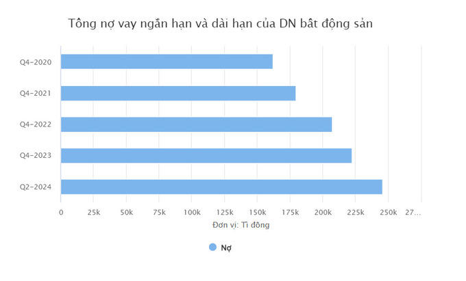 Báo cáo cũng cho thấy tình hình vay nợ của các doanh nghiệp bất động sản tăng cao trong nửa đầu năm. Khả năng trả nợ của một số công ty có thể gặp khó trong giai đoạn tới. Quy mô dư nợ chủ yếu đến từ việc phát triển dự án mới của một số công ty bất động sản lớn như Vinhomes (tổng nợ tăng 63% so với cùng kỳ), Văn Phú Invest (54%), DIG (59%), Nhà Khang Điền (33%).