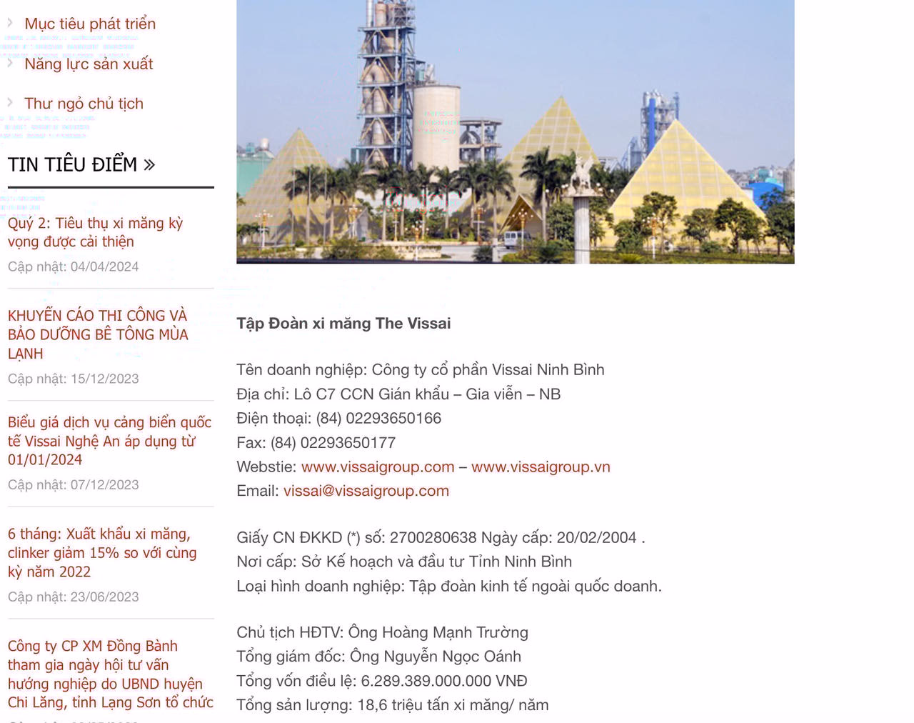 Hiện tại, Vissai Ninh Bình đang sở hữu hàng loạt nhà máy sản xuất xi măng nghìn tỷ đồng gồm: Nhà máy sản xuất Xi măng The Vissai Ninh Bình (5.000 tỷ đồng), Nhà máy sản xuất Xi măng tại Hà Nam (2.000 tỷ đồng), Nhà máy sản xuất Xi măng Vissai 3 (3.000 tỷ đồng), Nhà máy sản xuất Xi măng tại Lạng Sơn (2.000 tỷ đồng), Nhà máy sản xuất Xi măng Sông Lam 2 (1.200 tỷ đồng), Nhà máy xi măng Sông Lam (12.500 tỷ đồng).