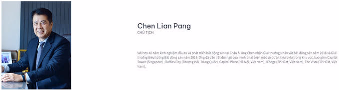 Ông Chen Lian Pang, Chủ tịch HĐQT, từng là CEO của CapitalLand. Ông Chen Lian Pang từng nhận danh hiệu “Nhân vật bất động sản của năm” trong khuôn khổ giải thưởng bất động sản Châu Á của PropertyGuru.