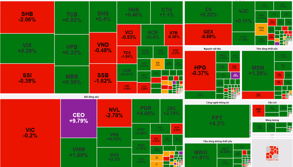 Sau giai đoạn điều chỉnh mạnh, nhóm bất động sản có phiên bật dậy ấn tượng. Cổ phiếu CEO tăng trần 9,79%, trở thành tâm điểm chú ý với sắc tím hiếm hoi trên sàn. Bên cạnh đó, hàng loạt mã lớn như VHM (+1,89%), PDR (+4,08%), DIG (+2,74%), DXG (+2,5%) hay HDC (+3,06%) đều tăng mạnh, góp phần củng cố tâm lý thị trường.