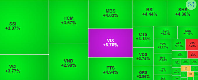 Tại nhóm này, hầu hết các mã lên giá, trong đó VIX tăng kịch trần, CTS tăng 3,13%, FTS “đội” 4,94%, VDS tăng 3,75%, SSI (3,07%), HCM (3,67%)…