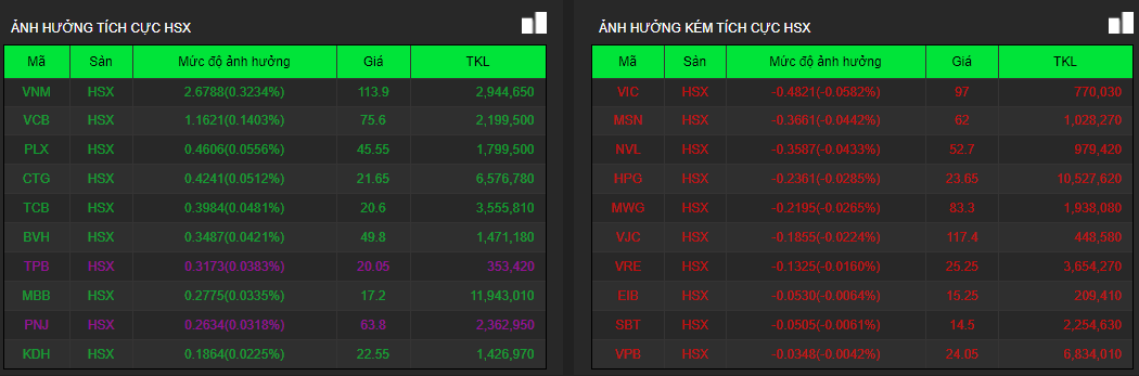 Ở nhóm cổ phiếu lớn, các mã như HSG, PNJ và TPB đều được kéo lên mức giá trần. Bên cạnh đó, VNM tăng đến 5% lên 113.900 đồng/cp, CTD tăng 4,1% lên 69.000 đồng/cp, BVH tăng 3,4% lên 49.800 đồng/cp, PLX tăng 2,8% lên 45.550 đồng/cp.