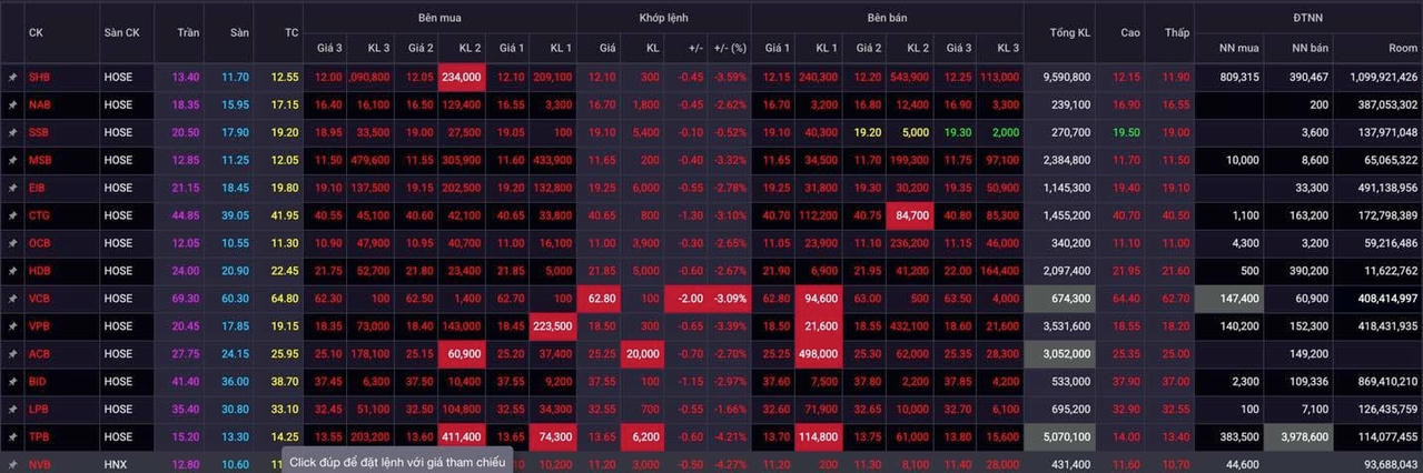 Nhóm ngân hàng cũng không ngoại lệ, ghi nhận mức giảm từ 3-5%, phản ánh tâm lý hoảng loạn của nhà đầu tư. Ngay cả những cổ phiếu được đánh giá là có sức chống chịu tốt như SHB và TCB cũng "thất thủ" trước áp lực bán mạnh.