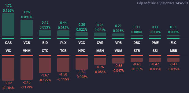 Đối với nhóm cổ phiếu bất động sản, hầu hết các mã vốn hóa lớn đều giảm giá ở phiên 16/6 và cũng có tác động không nhỏ khiến VN-Index đi xuống. Trong đó VIC giảm 2,1%, VHM giảm 2,3%. VIC và VHM cũng là 2 mã ảnh hưởng tiêu cực nhất đến VN-Index khi lấy đi của chỉ số này lần lượt 2,52 điểm (-0,18%) và 2,45 điểm (-0,18%). Bên cạnh đó, VRE giảm 0,2%, PDR giảm 0,5% còn BCM giảm 0,2%. THD là mã bất động sản vốn hóa lớn hiếm hoi giữ được sắc xanh khi tăng 0,3%.