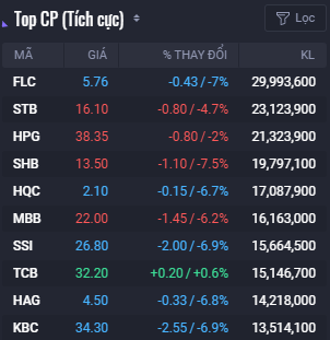 Bên cạnh nhóm chứng khoán, các cổ phiếu bất động sản cũng là nhóm chịu ảnh hưởng nặng nề nhất từ áp lực bán trong phiên 1/2. Trong đó, nhà đầu tư tiếp tục chứng kiến hàng loạt cổ phiếu bất động sản có yếu tố thị trường cao giảm sàn như TIG, CEO, NTL, OGC, SCR, KBC, TDH, DXG, HAR, FLC, HDG, TCB, HQC, ASM, FIT… Ngoài ra, KDH giảm 6,3% xuống 29.900 đồng/cp, CII giảm 3,6% xuống 20.100 đồng/cp, BCM giảm 3,6% xuống 54.000 đồng/cp, PDR giảm 2,3% xuống 54.500 đồng/cp.
