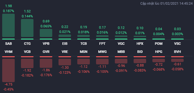 Sau phiên giao dịch hưng phấn hôm 29/1, thị trường chứng khoán bước vào phiên giao dịch đầu tháng 2 với diễn biến tích cực khi hàng loạt cổ phiếu vốn hóa lớn tăng giá mạnh. Có thời điểm, VN-Index tăng lên gần 18 điểm. Tuy nhiên, diễn biến bất ngờ đã xảy ra khi áp lực bán mạnh với khối lượng rất lớn xuất hiện, kéo nhiều cổ phiếu trụ cột lao dốc. Các chỉ số vì vậy cũng đảo chiều giảm trở lại.