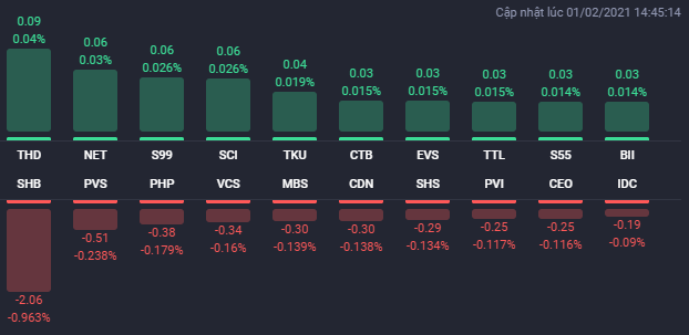 Kết thúc phiên giao dịch, VN-Index giảm 21,1 điểm (-2%) xuống 1.035,51 điểm. Toàn sàn có 90 mã tăng, 369 mã giảm và 37 mã đứng giá. HNX-Index giảm 5,36 điểm (-2,5%) xuống 208,85 điểm. Toàn sàn có 61 mã tăng, 140 mã giảm và 32 mã đứng giá. UPCoM-Index giảm 1 điểm (-1,39%) xuống 71,08 điểm.
