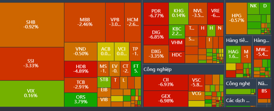 Nhóm cổ phiếu bất động sản và ngân hàng chịu tác động nặng nề nhất, kéo thị trường đi xuống. VHM (Vinhomes) giảm kịch sàn -6,99%, VRE (Vincom Retail) cũng sàn -6,99%, DXG (Đất Xanh) mất -5,38%. CEO (Tập đoàn CEO) lao dốc mạnh -9,74%, PDR (Phát triển Bất động sản Phát Đạt) giảm -6,77%. Ngân hàng cũng đỏ lửa: HDB (HDBank) -4,89%, TCB (Techcombank) -2,91%, MBB (MBBank) -2,46%, VPB (VPBank) -3,08%. SSI (Chứng khoán SSI) giảm -3,33%, VIC (Vingroup) -2,28%, MWG (Thế Giới Di Động) -5,48%. Những mã lớn này chiếm tỷ trọng cao trong rổ VN30, góp phần đẩy chỉ số mất mốc 1.680 điểm.
