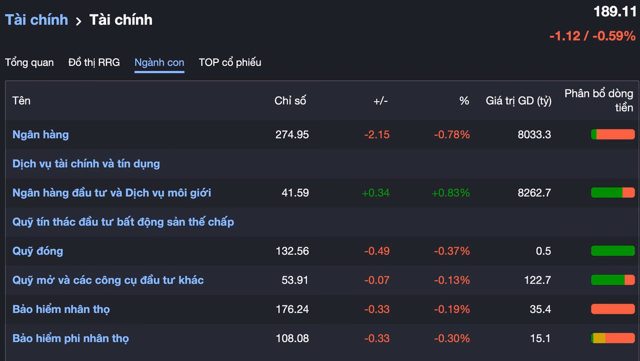 Nhóm ngân hàng chứng kiến áp lực bán mạnh, với hàng loạt mã lớn như SHB, VPB, VCB, BID, CTG, MBB, TCB, VIB, STB đều giảm giá. Tuy nhiên, một số ngân hàng quy mô nhỏ như BVB, ABB, KLB, VBB, PGB, BAB, SGB lại ghi nhận diễn biến tích cực, tạo điểm nhấn trái chiều.