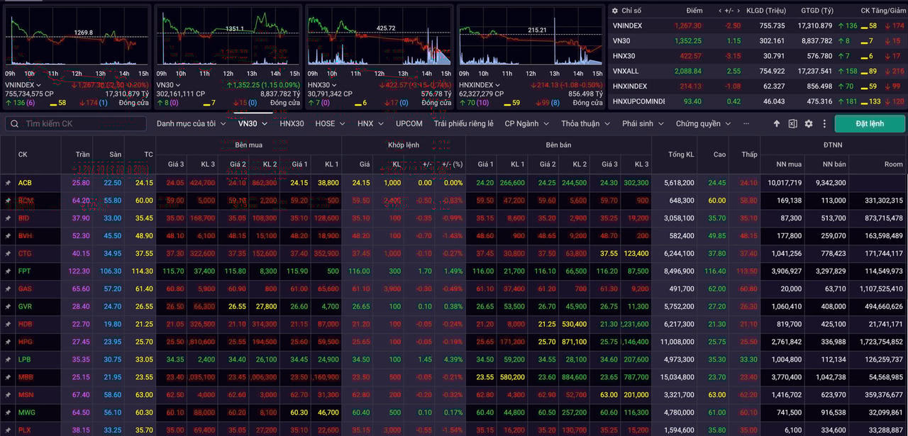 Trong rổ VN30, cổ phiếu LPB nổi bật với mức tăng 4,39%, nối dài chuỗi phiên tích cực. FPT, SAB, VNM và TCB cũng góp phần giữ nhịp cho thị trường khi duy trì được sắc xanh, dù mức tăng chỉ quanh 1%. Ở chiều ngược lại, VIC quay đầu giảm 2,55%, gây áp lực đáng kể lên chỉ số. Các mã lớn khác như BID, VCB, BVH và PLX tiếp tục điều chỉnh nhẹ.
