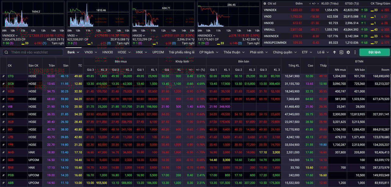 Làn sóng bán lan rộng trên toàn thị trường, khiến số mã giảm điểm áp đảo. Trên HoSE, có tới 282 cổ phiếu giảm, trong khi chỉ 58 mã tăng và 33 mã đứng giá. HNX cũng chứng kiến 146 mã đỏ, vượt xa 29 mã tăng và 33 mã tham chiếu. UPCoM không ngoại lệ khi có 171 mã giảm, so với 68 mã tăng và 77 mã giữ giá.