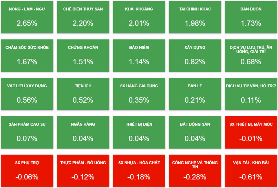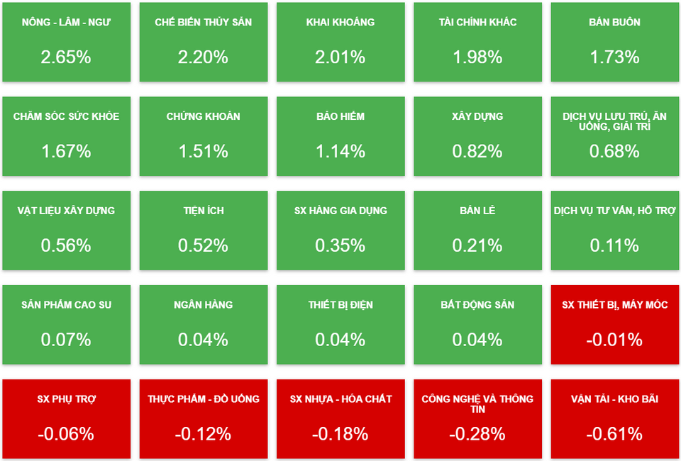 Tại nhóm bất động sản, sự phân hóa diễn ra vẫn rõ nét. Bên cạnh những mã vốn hóa lớn đã đề cập ở trên thì NVL và THD là 2 mã vẫn giữ được sự tích cực. Trong đó, NVL tăng 1,9% lên 107.500 đồng/cp và có đóng góp lớn trong việc giữ sắc xanh của VN-Index. THD tăng nhẹ 0,1% lên 209.700 đồng/cp, đây cũng là phiên tăng điểm thứ 12 của cổ phiếu này.