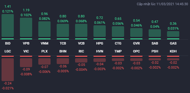 Phiên giao dịch ngày 11/3 của thị trường chứng khoán Việt Nam diễn ra theo chiều hướng tích cực khi VN-Index và HNX-Index giao dịch ở trên mốc tham chiếu trong suốt phiên. Mở cửa phiên, sắc xanh đã bao trùm lên nhóm cổ phiếu vốn hóa lớn và điều này giúp kéo các chỉ số lên trên mốc tham chiếu. Dù đôi lúc vẫn vấp phải áp lực bán mạnh, nhưng cả VN-Index và HNX-Index vẫn duy trì được đà tăng tốt.
