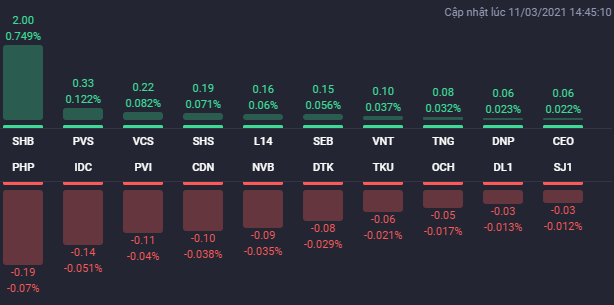 Động lực tăng chính của thị trường phiên 11/3 đến từ nhóm cổ phiếu ngân hàng. Trong đó, SHB tăng đến 6,1% lên 17.300 đồng/cp, VPB tăng 4,2% lên 43.750 đồng/cp, STB tăng 3,2% lên 19.300 đồng/cp, BID tăng 3,1% lên 43.300 đồng/cp, TCB tăng 2,2% lên 40.150 đồng/cp.