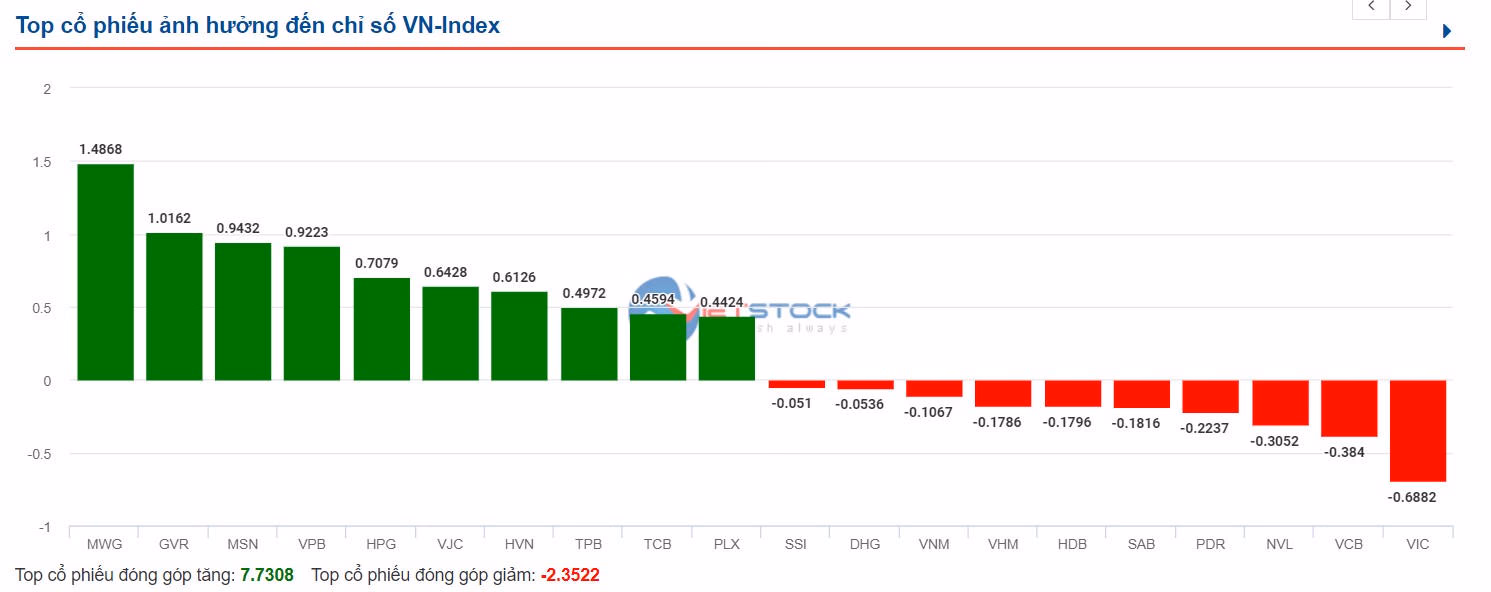 Về diễn biến thị trường, trong rổ VN30 có thể thấy nhóm ngân hàng đã quay trở lại đà tăng giá với hàng loạt mã như: ACB (+0,9%), BID (+0,5%), CTG (+0,25%), VPB (+2,3%), ngoài ra cũng có một số mã ngân hàng giảm điểm phải kể đến như VCB (-0,4%), HDB (-1,3%)…Bên cạnh đó MWG hôm nay cũng tăng mạnh 6,7%, đóng góp tích cực nhất cho đà tăng của VN-Index.