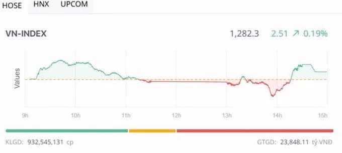 Đóng cửa phiên giao dịch ngày 20/6, VN-Index tăng 2,51 điểm (+0,20%), lên 1.282,3 điểm. Sàn HoSE có 189 mã tăng, 242 mã giảm, 72 mã đứng giá. Tổng khối lượng giao dịch đạt hơn 932,5 triệu đơn vị, giá trị 23.848,1 tỷ đồng, giảm 7% về khối lượng và 8% về giá trị so với phiên hôm qua. Giao dịch thỏa thuận đóng góp hơn 111,4 triệu đơn vị, giá trị 2.490 tỷ đồng.