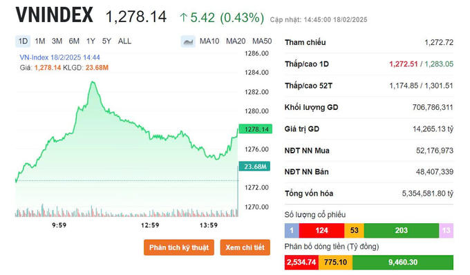 Tuy nhiên, VN-Index nhanh chóng hồi phục sau đó và kết phiên tại 1.278,14 điểm, tăng 5,42 điểm (+0,43%). Đóng cửa, sàn HoSE có 293 mã tăng và 162 mã giảm. Thanh khoản đạt 707 triệu đơn vị, cao hơn phiên liền trước và trung bình 20 phiên, giá trị giao dịch tương ứng 14.265 tỷ đồng.