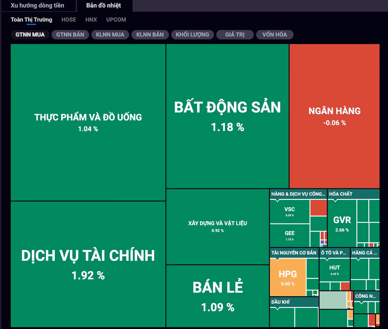 Diễn biến tích cực trong phiên sáng ghi nhận tại một số nhóm ngành như thực phẩm - đồ uống, bất động sản, bán lẻ, dịch vụ tài chính và vật liệu xây dựng. Nhiều cổ phiếu nổi bật tăng mạnh như MSN (+4,86%), HAG (+2,16%), PAN (+2,99%), CEO (+8%), NVL (+4,88%), DIG (+4,93%). Đây cũng là những nhóm đóng vai trò dẫn dắt thị trường, với các mã tiêu biểu gồm VHM, MSN, GVR, NVL, VNM.